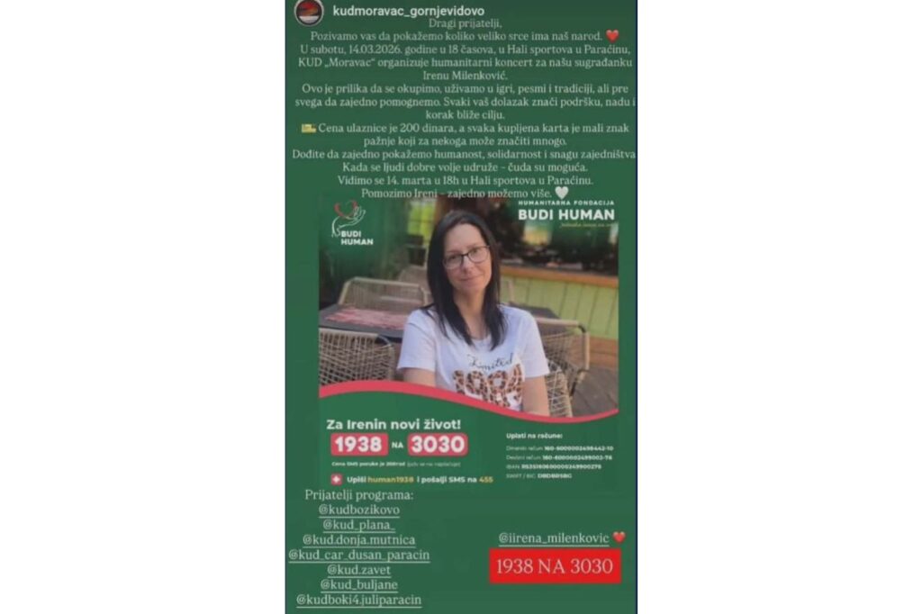 У Хали спортова у Параћину, у суботу 14. марта 2026. године са почетком у 18 часова, биће одржан хуманитарни концерт са циљем прикупљања средстава за лечење Ирене Миленковић. Организатор догађаја је КУД „Моравац“ из Горњег Видова, а концерт ће окупити више културно-уметничких друштава која ће својим наступима подржати ову хуманитарну акцију.