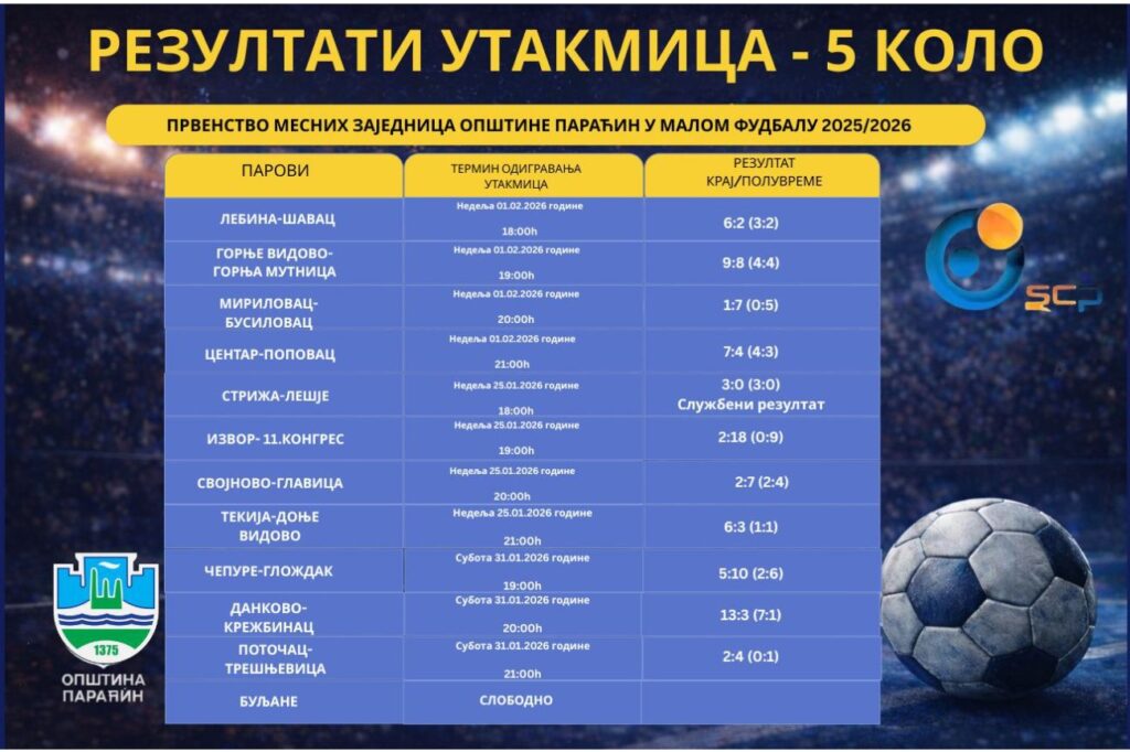 Овог викенда одржано је 5. коло 16. Првенства месних заједница општине Параћин у малом фудбалу, које је донело много узбуђења и неочекиваних резултата.