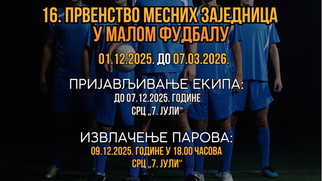 Установа СРЦ „7. Јули“ Параћин организује XVI Првенство месних заједница општине Параћин у малом фудбалу, које ће се одржати у периоду од 1. децембра 2025. до 7. марта 2026. године, под покровитељством Општине Параћин.